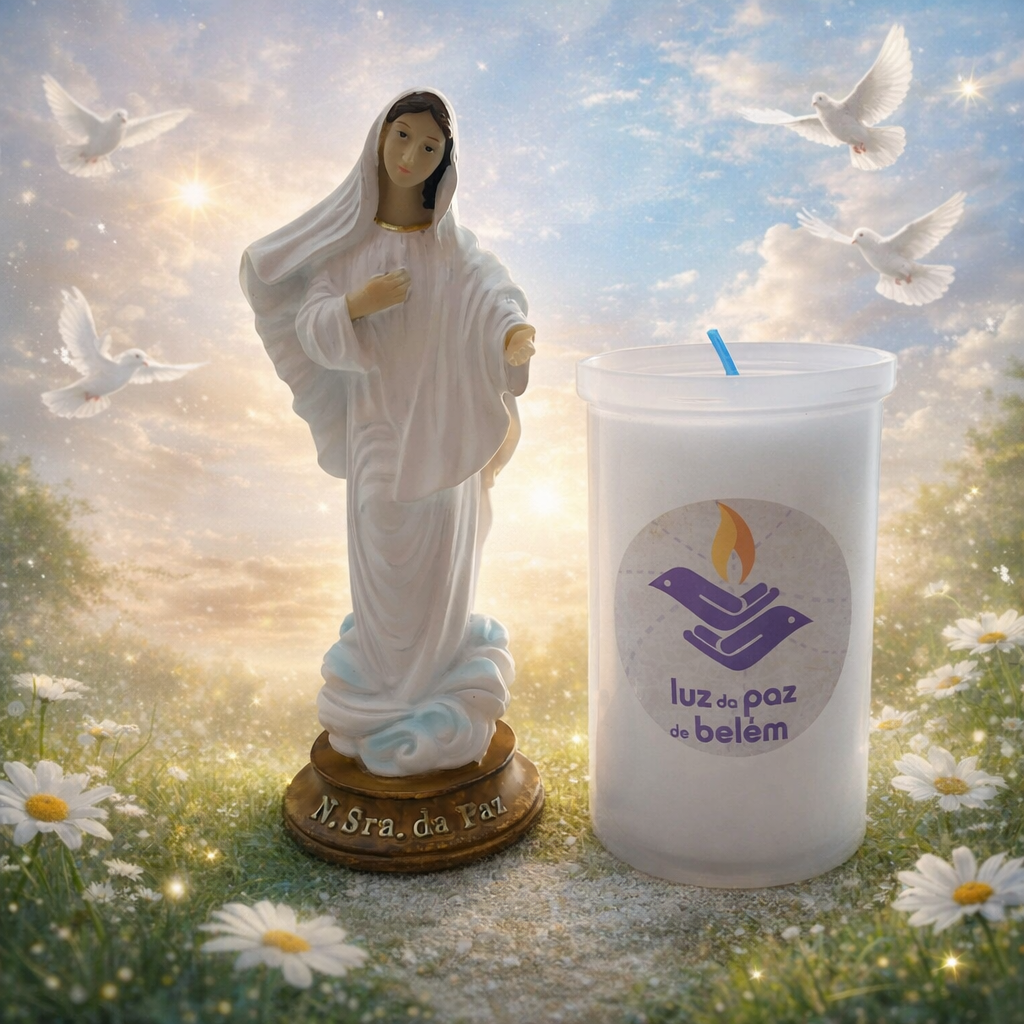 Este conjunto especial reúne a imagem de Nossa Senhora da Paz, com aproximadamente 15 cm de altura, acompanhada por uma vela “Luz da Paz de Belém”, símbolo de esperança, fé e serenidade.