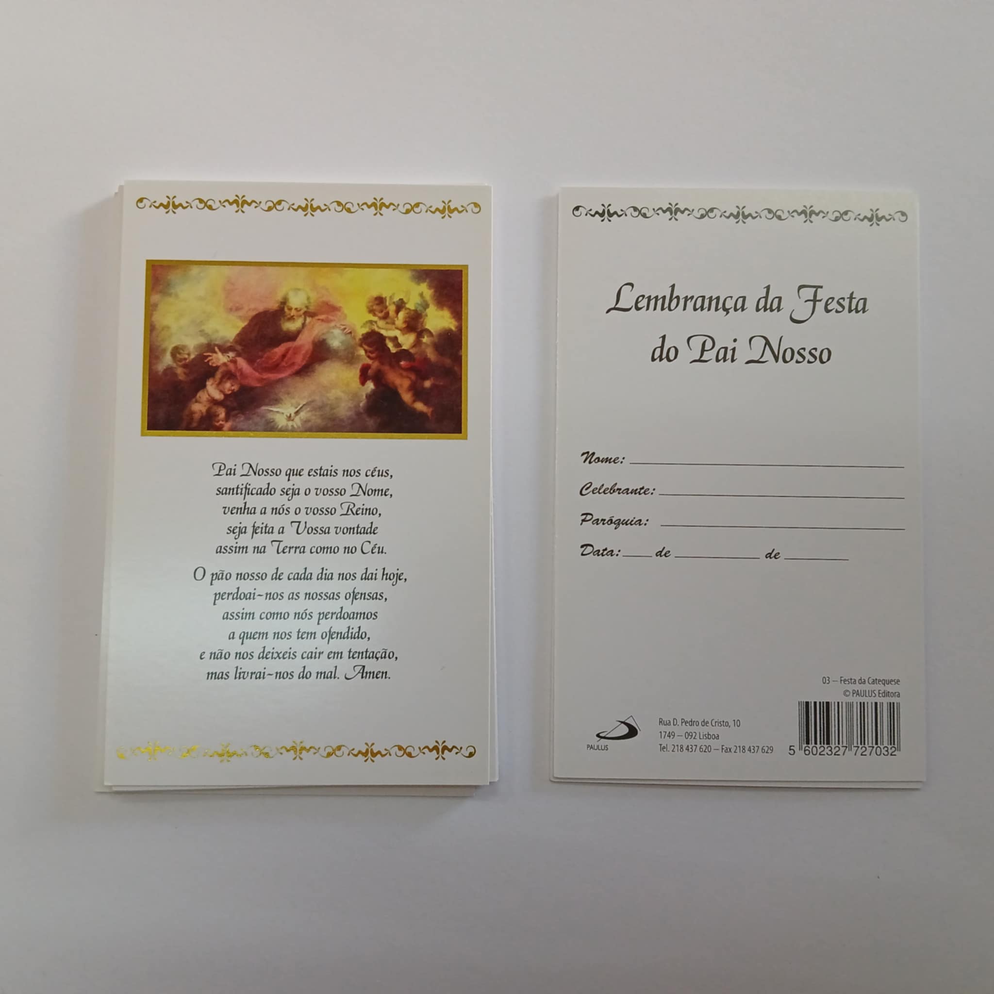 Pagela com a oração Pai Nosso, mede 12cm de altura por 7,5 cm comprimento.